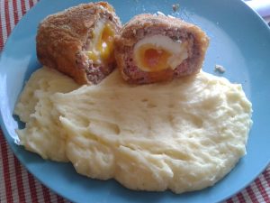 500 g mletého masa 4 vejce rozmarýn a tymián sůl a pepř 1 lžíce hořčice Maso smícháme s bylinkami, osolíme a opepříme a rozdělíme na 4 stejné díly. Vajíčka uvaříme přesně 6 minut a prudce zchladíme. Po vychladnutí opatrně oloupeme. Z každého dílu masa vytvoříme placku na potravinové fólii a do ní opatrně zabalíme vejce. … Pokračování textu Skotská vejce